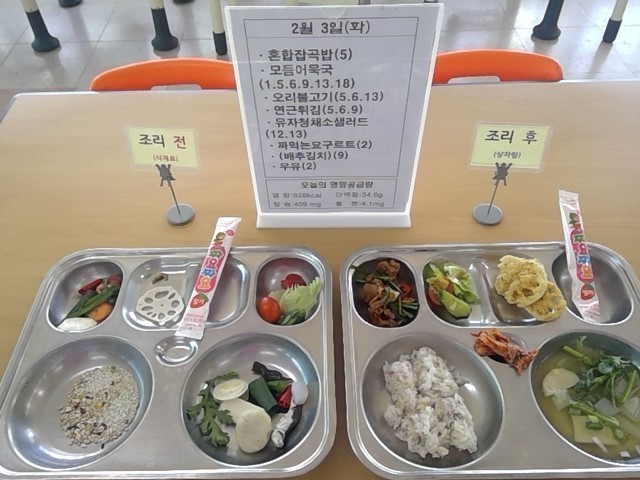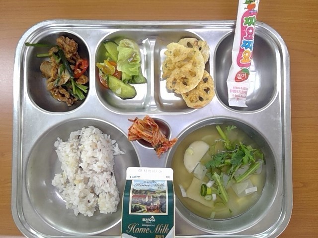 혼합잡곡밥, 모듬어묵국, 오리불고기, 연근튀김, 유자청채소샐러드, 짜먹는 요구르트, 우유, (배추김치)