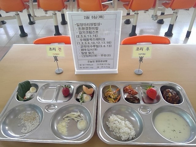 * 밀양생산 식재료: 감자, 양파, 쌀, 찹쌀, 딸기, 깻잎, 양배추, 달걀, 쇠고기(육가공업체 밀양), 갓김치(김치제조업체-밀양), 매실농축액(제조업체-밀양)