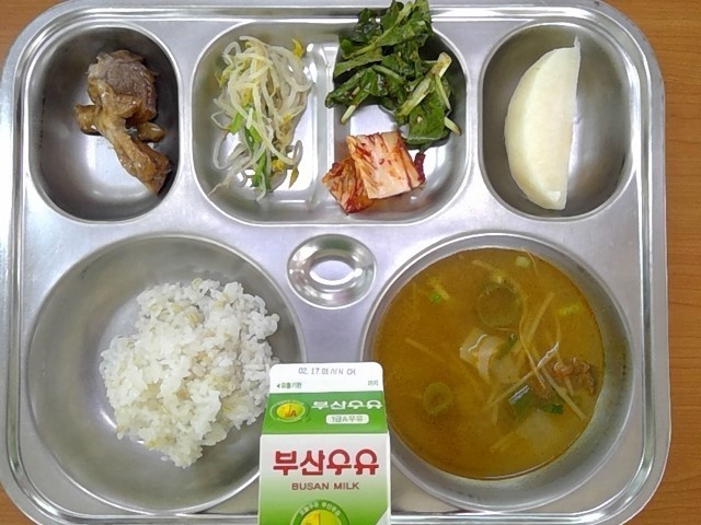 찰보리밥, 쇠고기무국, 오향장육, 숙주미나리무침, 배추김치, 배, 우유, (겨울초무침)