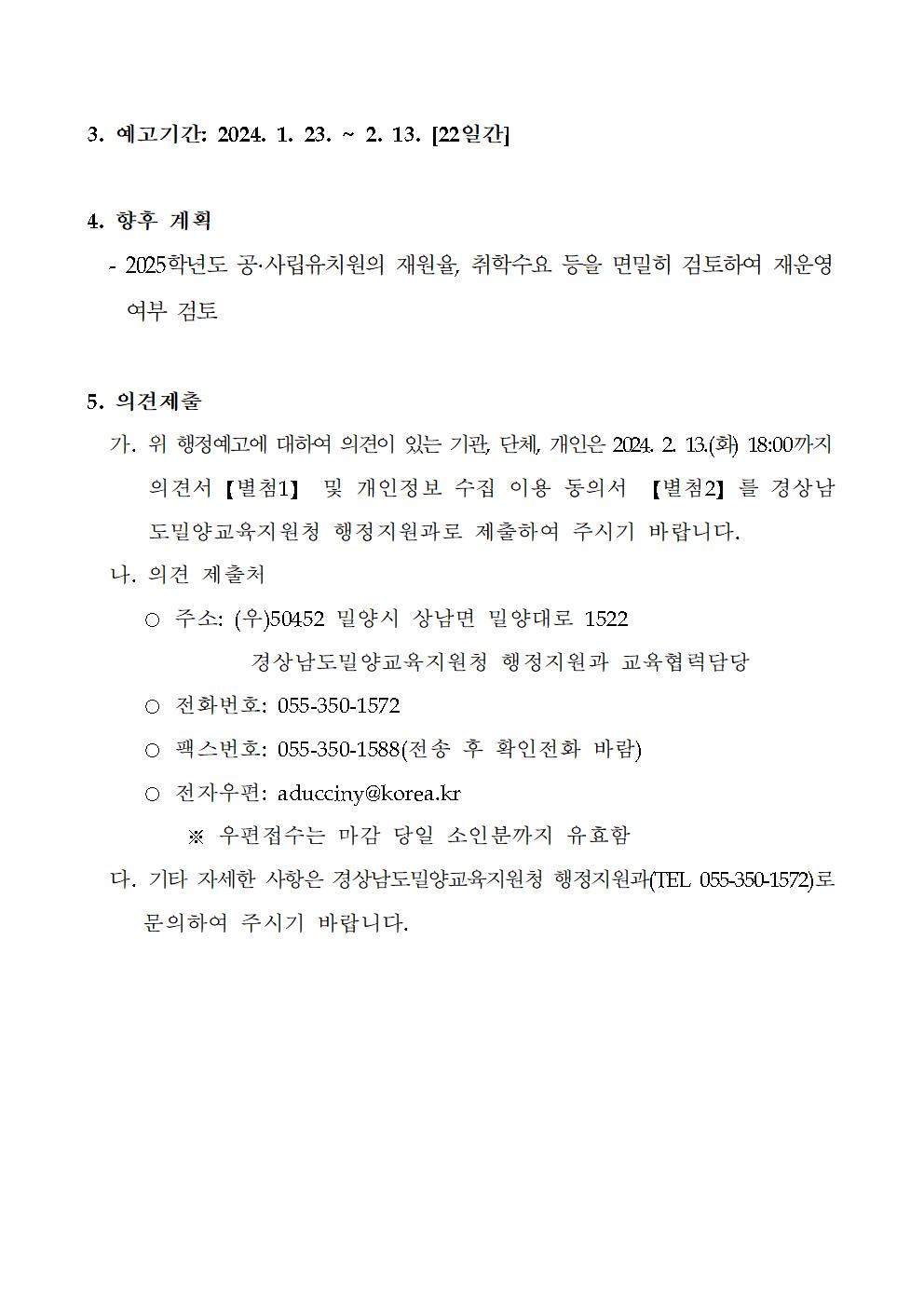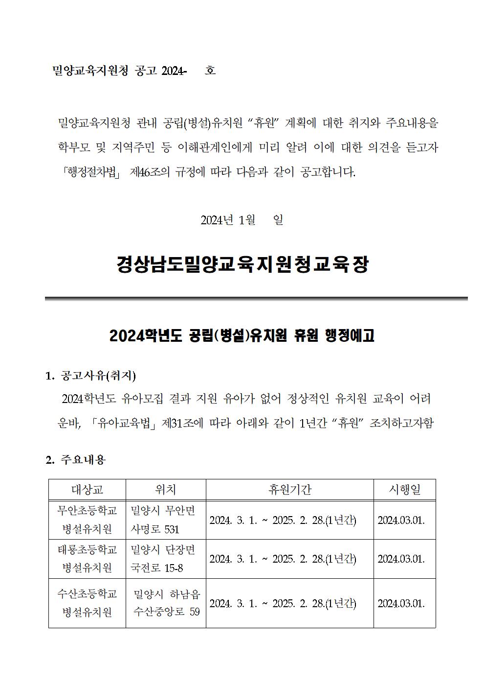 2024학년도 공립(병설)유치원 휴원 행정예고