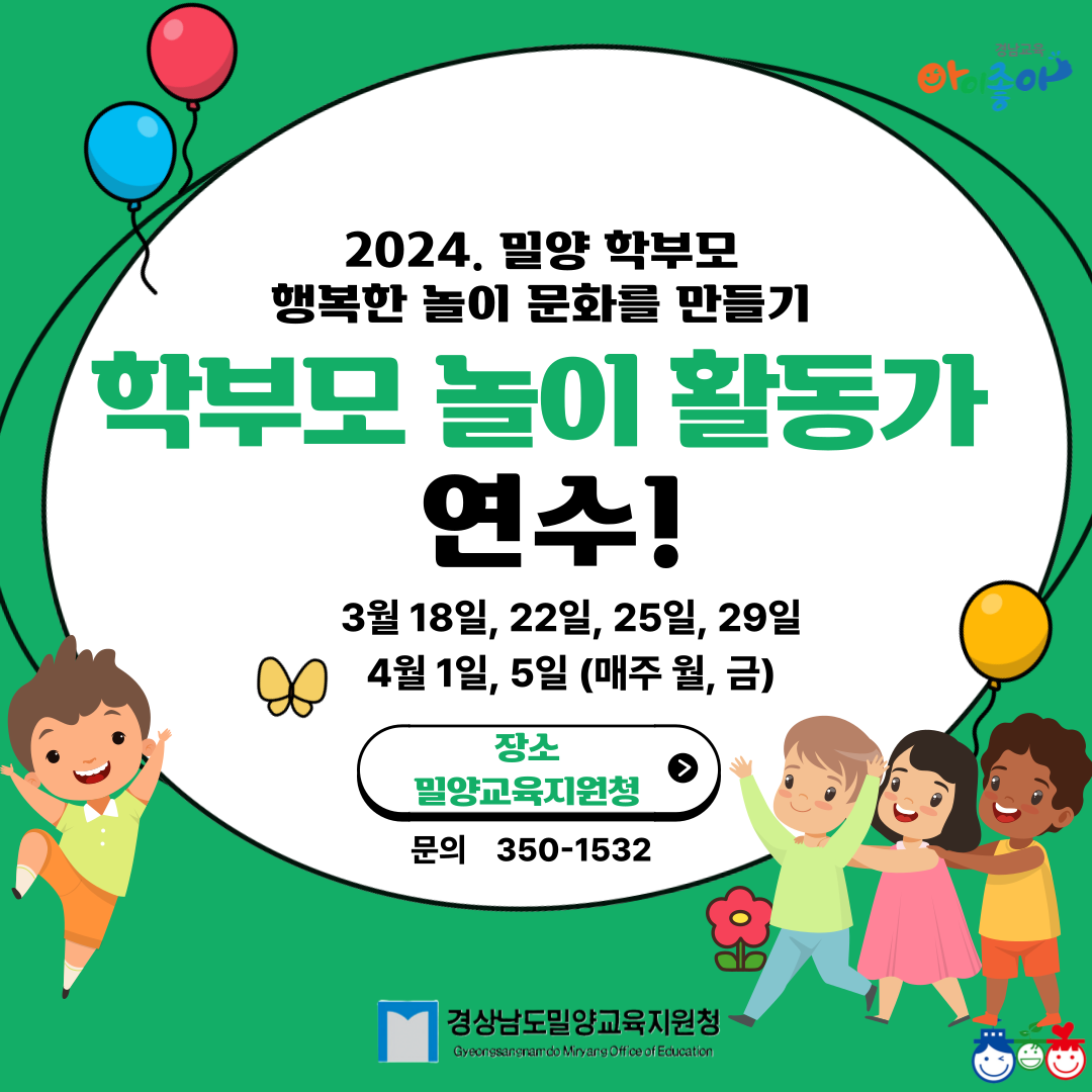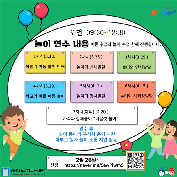 아이들과 행복한 소통 2024. 학부모 놀이 활동가 연수 안내 아이들과 즐겁게 놀이로 소통하고 싶은 분, 학부모들과 재밌는 동아리 활동으로 소통과 건강한 놀이문화를 만들어 가실 분 모두모두 환영합니다. ? 참여일정 3월 18일, 22일, 25일, 29일, 4월 1일, 5일 (매주 월, 금) / 4월 20일 가족놀이 기획 ? 신청대상 아이들과 건강한 놀이문화에 관심있는 학부모(학교 동아리) 30명 ? 온 라 인 https://naver.me/5ewPiwmS