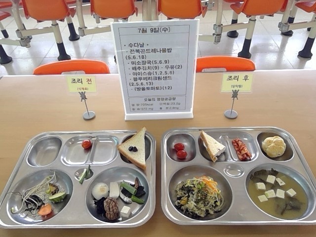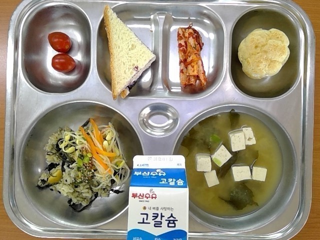 전복곤드레나물밥, 미소장국, 블루베리크림샌드, 아이스슈, 배추김치, 우유, (방울토마토)