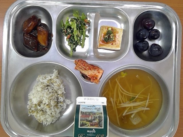 차조밥, 쇠고기무국, 두부양념구이, 짜장소스구멍떡볶이, 열무된장무침, 거봉, 우유, (배추김치)