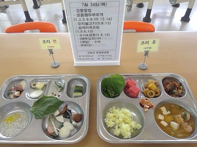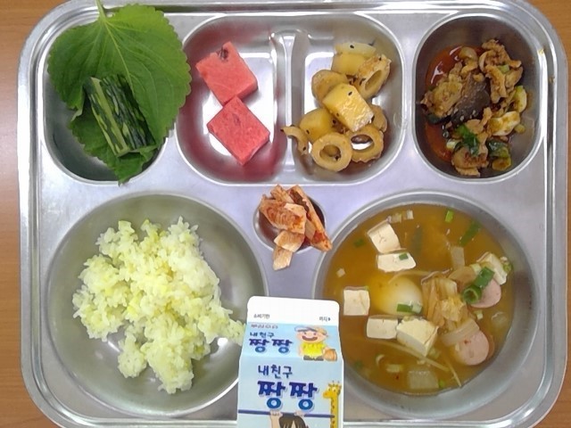 강황쌀밥, 모듬햄두부찌개, 오리불고기, 감자어묵조림, 오이&쌈장, 수박, 우유, (배추김치, 밀양깻잎)