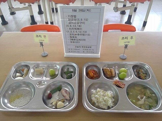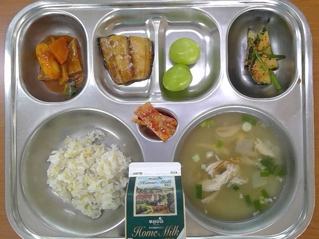 기장밥, 닭곰탕, 삼치순살구이, 치즈떡볶이, 오이부추무침, 청포도, 우유, (배추김치)