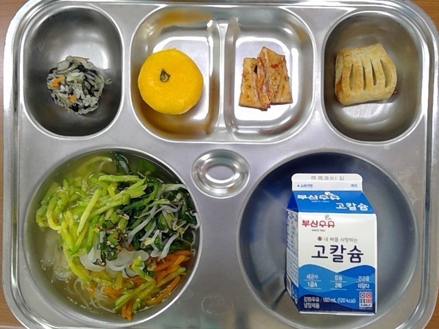 멸치주먹밥, 물국수, 고구마파이, 배추김치, 귤, 우유