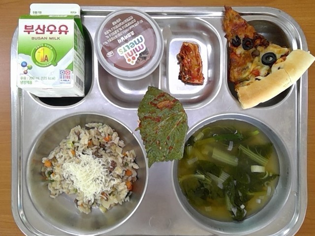 쇠고기볶음밥, 배추된장국, 치즈크러스트피자, 구슬아이스크림, 배추김치, 우유, (깻잎생절이)