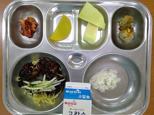 짜장면, 적은 밥, 비빔굴림만두, 배추김치, 멜론, 우유, (단무지)