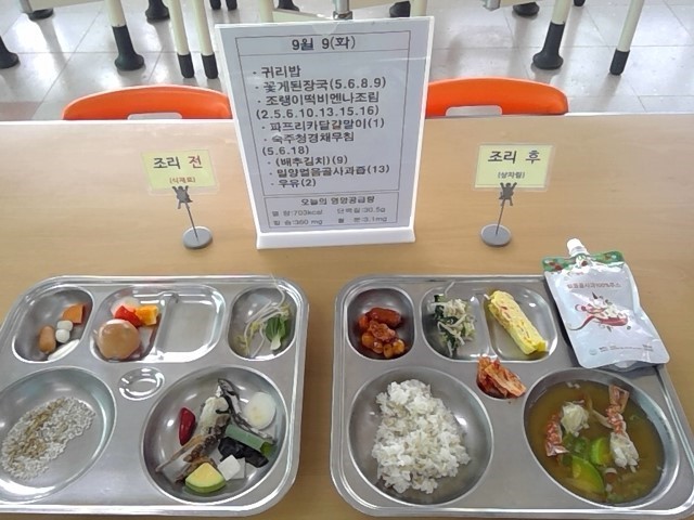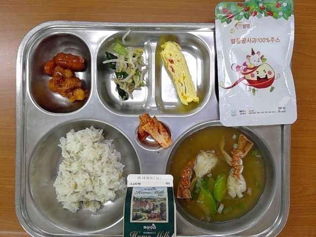 귀리밥, 꽃게된장국, 파프리카달걀말이, 조랭이떡비엔나조림, 숙주청경채무침, 밀양얼음골사과즙, 우유, (배추김치)