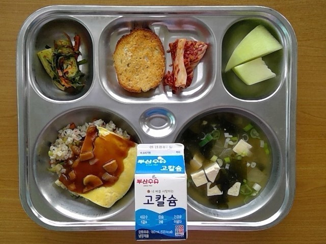 오므라이스, 미소장국, 우리밀 마늘토스트, 배추김치, 멜론, 우유, (오이소박이)