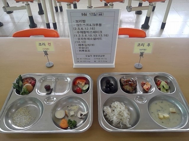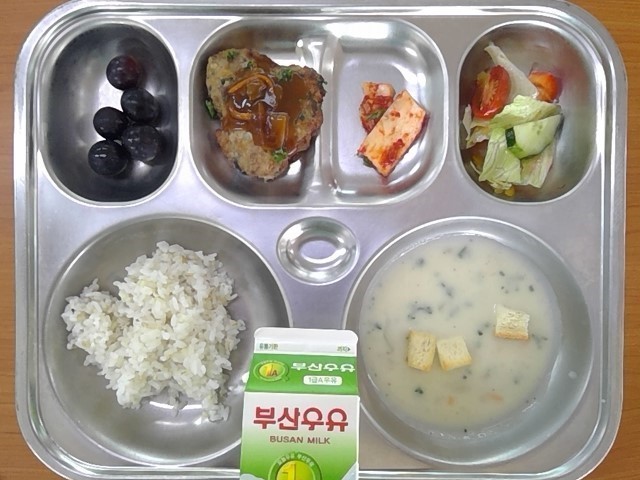 보리밥, 크림스프&크루통, 수제함박스테이크, 유자청채소샐러드, 배추김치, 머루포도, 우유