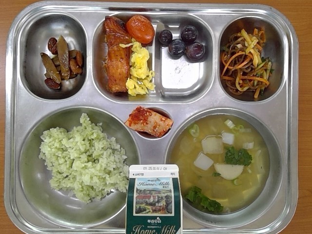 클로렐라밥, 모듬어묵국, 수비드연어구이&양파달걀볶음, 우엉아몬드조림, 비빔메밀막국수, 머루포도, 우유, (배추김치)