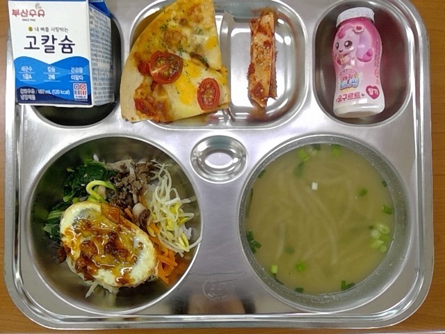 비빔밥&계란구이, 들깨무채국, 토마토또띠아피자, 배추김치, 딸기요구르트, 우유