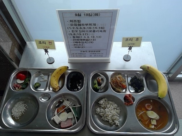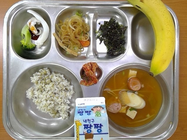 차조밥, 모듬햄두부찌개, 갑오징어브로콜리숙회, 잡채, 건파래볶음, 바나나, 우유, (배추김치)