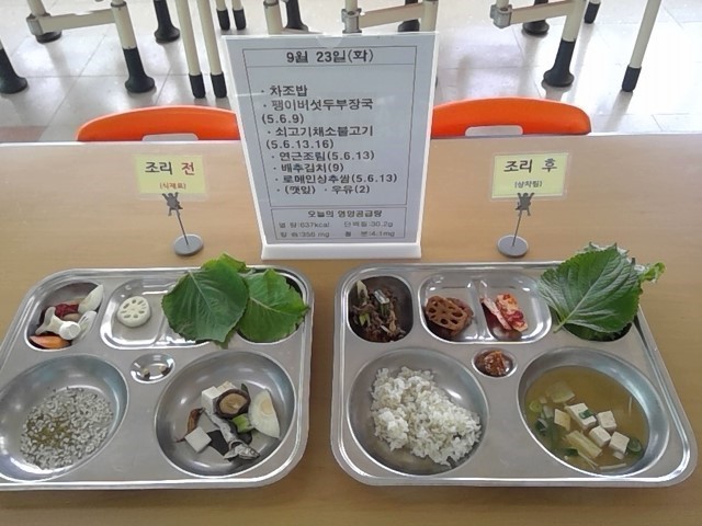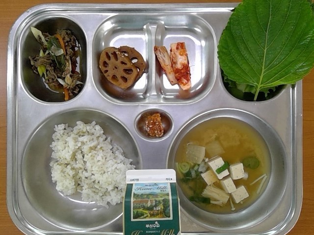 차조밥, 팽이버섯두부장국, 쇠고기채소불고기, 연근조림, 로메인상추&쌈장, 배추김치, 우유, (밀양깻잎)