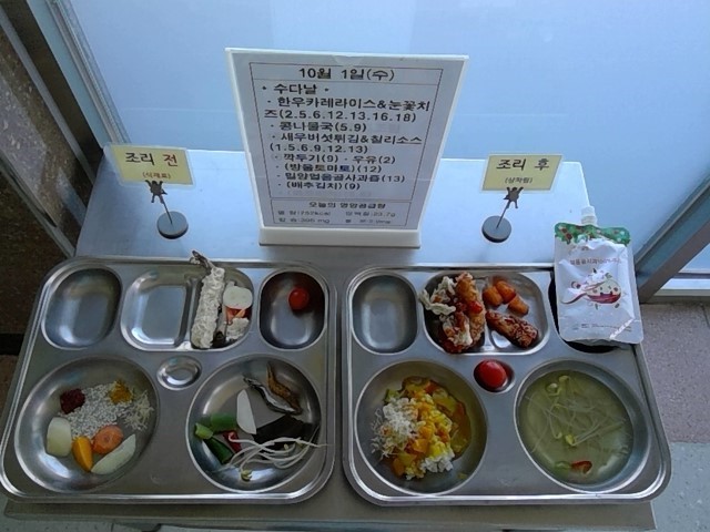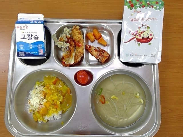 한우카레라이스&눈꽃치즈, 콩나물국, 새우버섯튀김&칠리소스, 깍두기, 얼음골사과즙, 우유, (방울토마토, 배추김치)