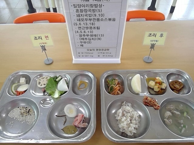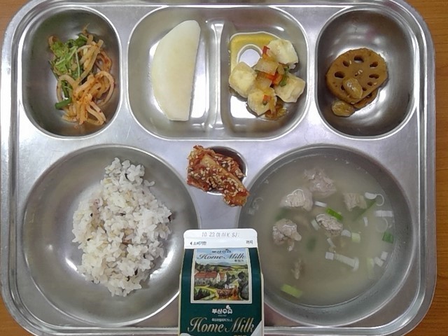 혼합잡곡밥, 돼지국밥, 네모두부깐풍소스조림, 연근땅콩조림, 쌈무무생채, 배, 우유