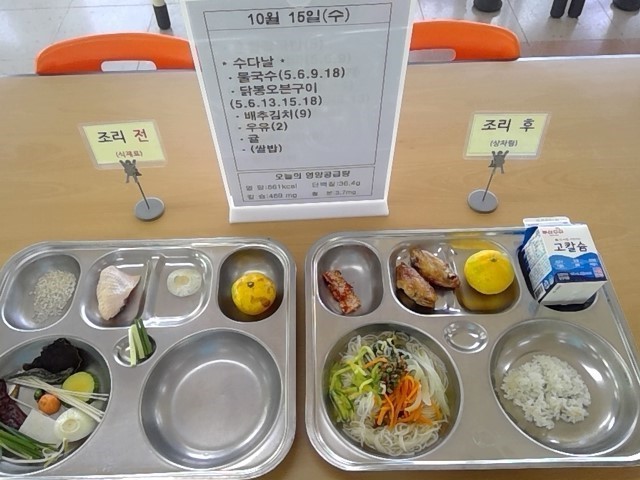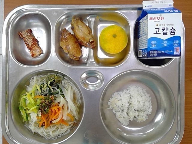 물국수, 닭봉오븐구이, 배추김치, 귤, 우유, (밥)