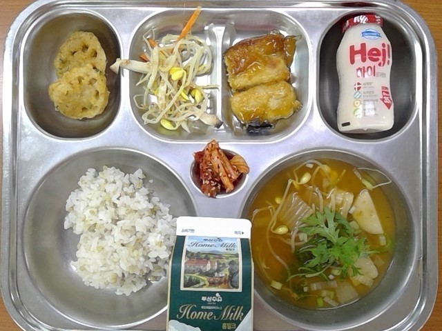 찰보리밥, 김치어묵국, 삼치순살유자소스구이, 콩나물새송이버섯무침, 연근튀김, 요구르트, 우유, (배추김치)
