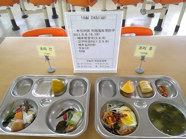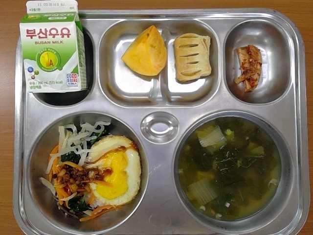 부드러운 비빔밥&계란구이, 배추된장국, 고구마파이, 단감, 배추김치, 우유