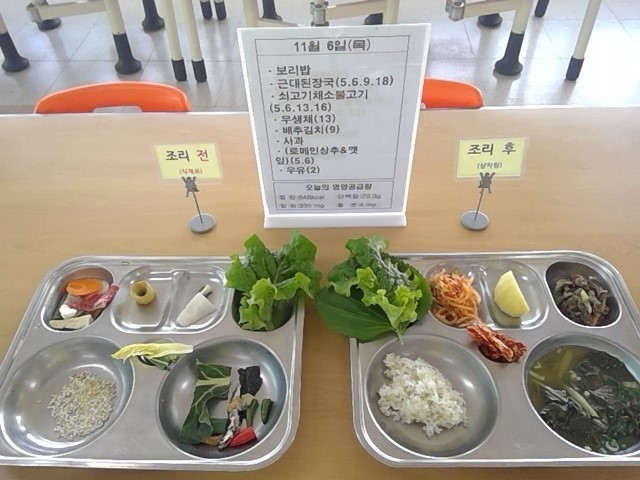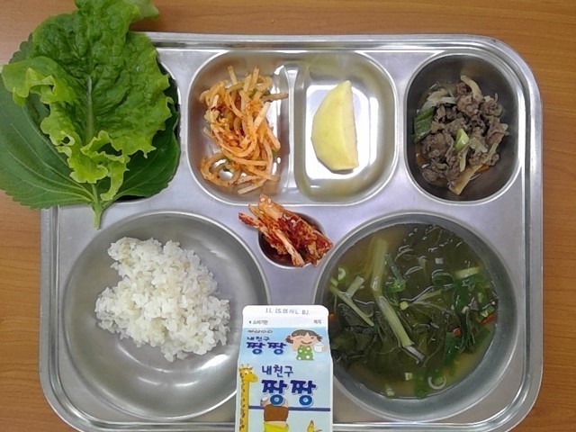 보리밥, 근대된장국, 쇠고기채소불고기, 무생채, 배추김치, 사과, 우유, (로메인상추와 깻잎)