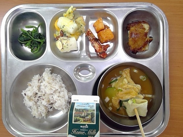 혼합잡곡밥, 짬뽕국&꼬치어묵, 임연수어순살데리야끼조림, 시금치나물, 깍두기, 가래떡치즈구이, 우유, (배추김치)
