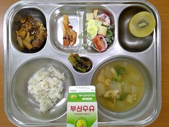 찰보리현미밥, 유부장국, 수제함박스테이크, 토마토크루통샐러드, 배추김치, 골드키위, 우유, (갓김치)