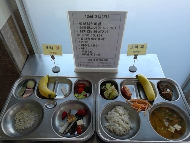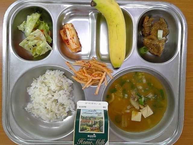 찰보리현미밥, 청국장찌개, 돼지갈비양념구이, 유자청채소샐러드, 배추김치, 바나나, 우유, (무생채)