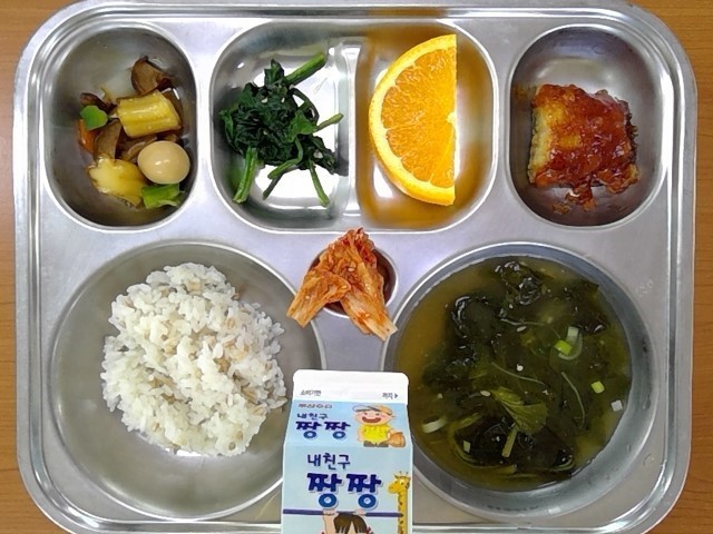 통밀밥, 바지락아욱국, 임연수어구이&양념치킨소스, 분모자메추리알조림, 시금치나물, 오렌지, 우유, (배추김치)