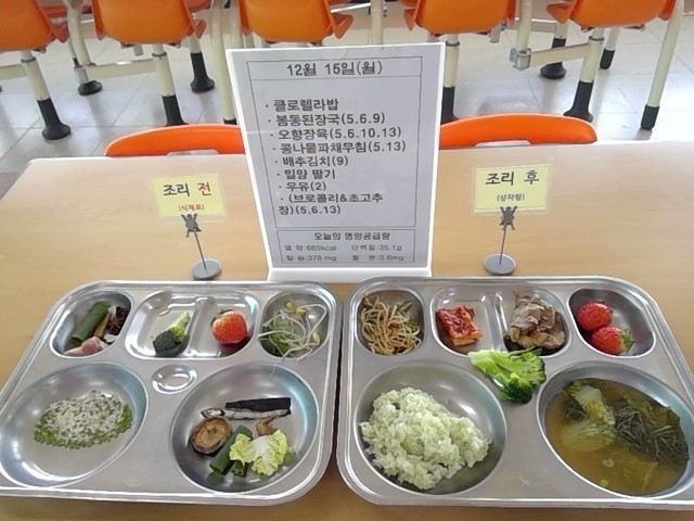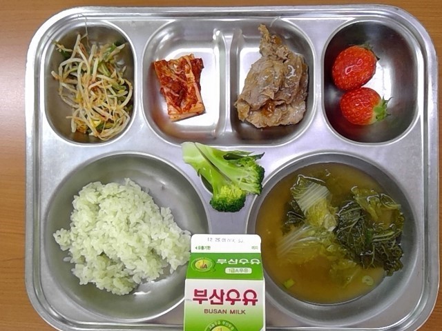 클로렐라밥, 봄동된장국, 오향장육, 콩나물파채무침, 배추김치, 밀양 딸기, 우유, (브로콜리&초고추장)
