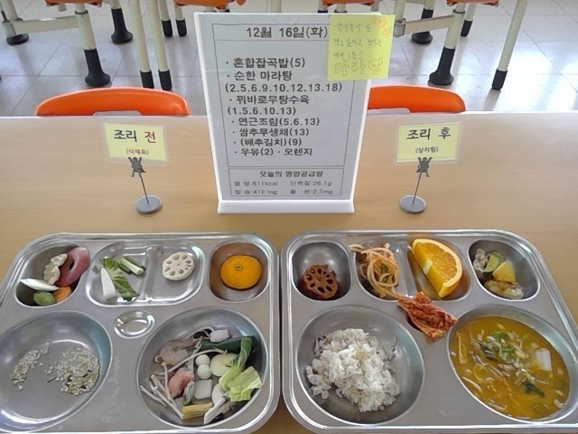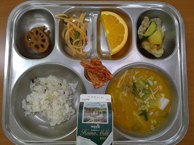 혼합잡곡밥, 순한 마라탕(학생들이 다시 먹고 싶다고 적어 내는 일등 메뉴), 꿔바로우탕수육, 연근조림, 쌈추무생채, 오렌지, 우유, (배추김치)
