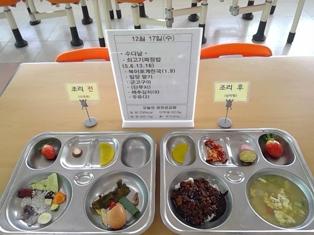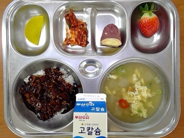 쇠고기짜장밥, 북어포계란국, 군고구마, 밀양 딸기, 배추김치, 우유, (단무지)