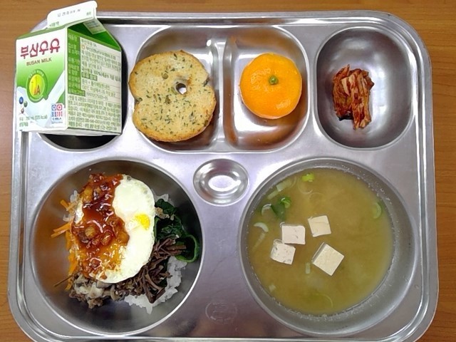 겨울비빔밥&계란구이, 팽이버섯두부장국, 우리밀 마늘토스트, 배추김치, 귤, 우유