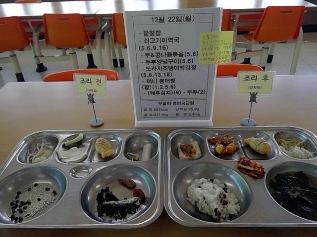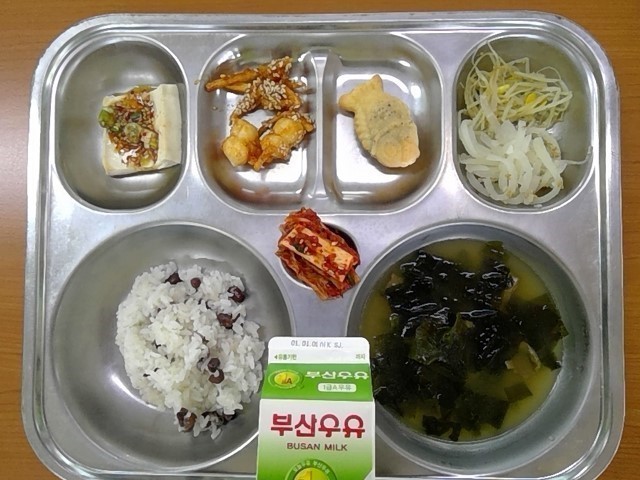 우리학교에서는 학생들의 기호를 고려하여 팥밥, 쇠고기미역국, 두부양념구이, 조랭이떡도라지강정, 무콩나물볶음, 미니붕어빵, 우유, (배추김치)를 제공합니다.