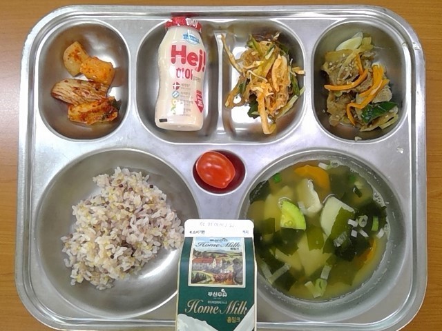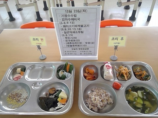 기장수수밥, 감자수제비국, 돼지고기바싹불고기, 실곤약채소무침, 깍두기, 요구르트, 우유, (배추김치, 방울토마토)