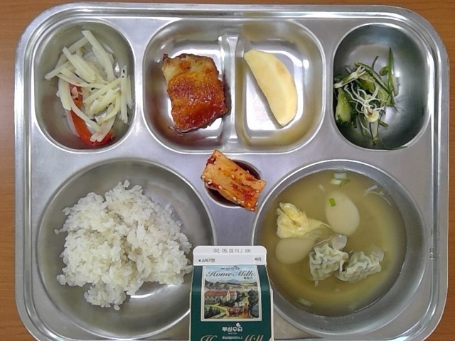 보리밥, 떡만두국, 임연수어구이&양념치킨소스, 밀양감자파프리카볶음, 오이달래무침, 사과, 우유, (배추김치)